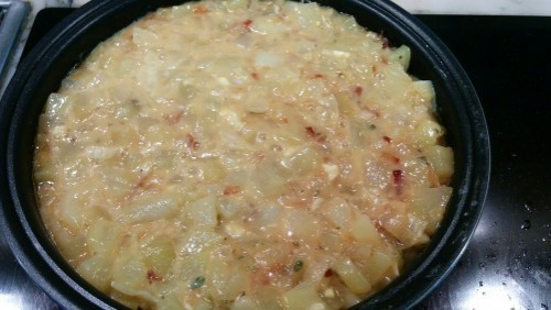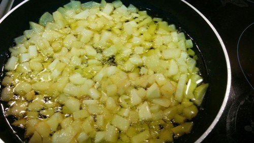 1En una paella hi fregim la ceba tallada a torssets petits. A una altre paella hi fregim les patates tallades a quadrets petits.