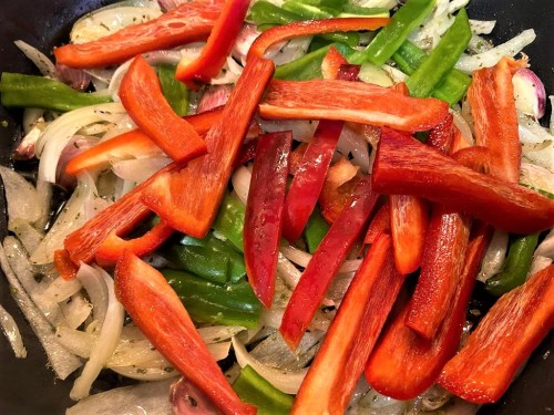 1Empezamos como siempre haciendo un buen sofrito. Ponemos en una cazuela baja un chorrito de aceite de oliva, añadimos la cebolla y unos dientes de ajo sin pelar, y dejamos que pochen bien. Posteriormente añadimos los pimientos, troceados en tiras.