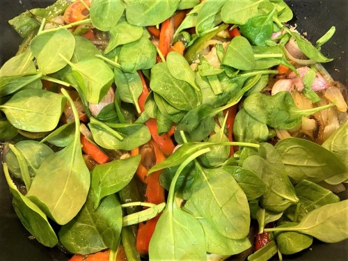 2Cuando el sofrito ha pochado bien, añadimos las espinacas con el toque del vino blanco (un chorrito), ponemos orégano, perejil y laurel al gusto( a veces le pongo algo de comino). Dejamos rehogarlas hasta que las espinacas tengan una apariencia de cocidas.