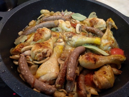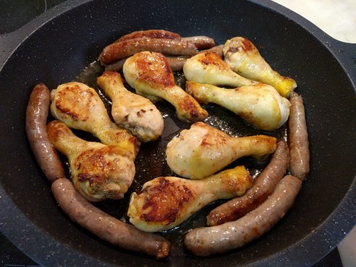 1Posem un raig d'oli a la cassola i comencem a fregir el pollastre i les salsitxes. Fins que quedin ben daurats.