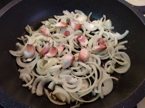 2Un cop estigui fet ho apartem en un plat. A la cassola hi tirem la ceba i tota la cabeça d'alls sense pelar.