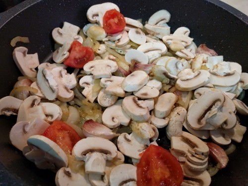 3Al cap de uns 15 min hi pode tirar els xampinyons i la tomata sense pell. Per pelar-la fàcil, la podem posar en aigua bullint 10 segons i després passar-la per aigua freda.