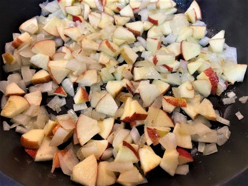 1Sofreímos la cebolla conjuntamente con la manzana picadita (suelo hacerlo en trocitos medianos).