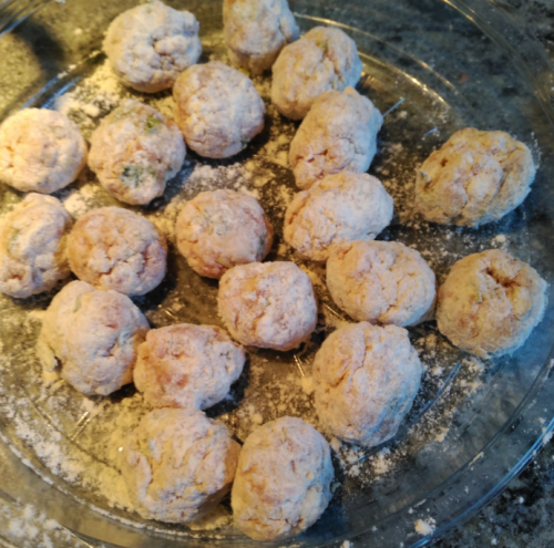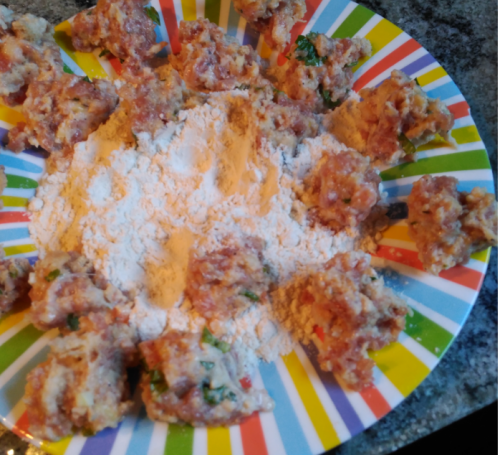 6Anem formant boletes i les enbadornem de farina. Després les fregim a la paella i quan estiguin fetes les barregem amb la samfaina.
