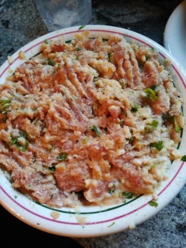 2Després farem les mandonguilles. En un plat hi posarem la carn picada juntament amb l'all i julivert picadet petit.