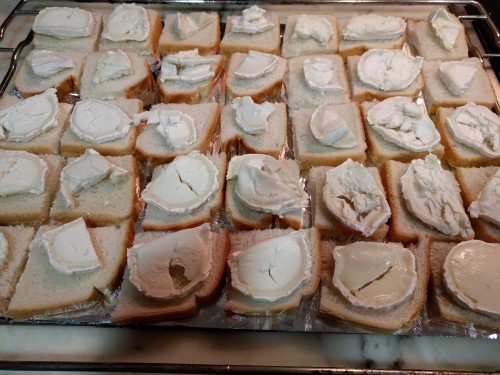 1Talles les llesques de pa bimbo amb 4 trossos. I poses una rodoneta de formatge de cabra a cada tros. Poses una mica de ceba carmelitzada a sobre de cada tros i ho poses al forn fins que quedi cruixent.