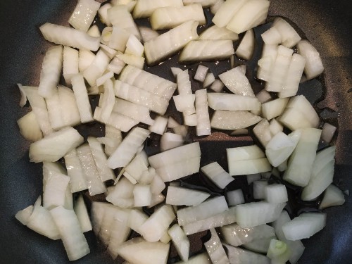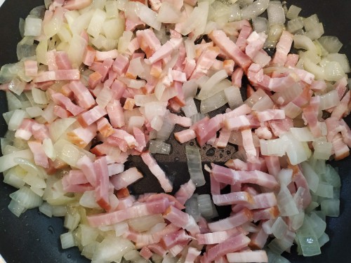 1Tallem les cebes i les sofregim a la paella. Al cap d'uns 15 min i posem el bacó