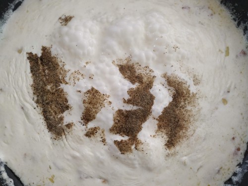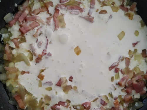 2Quan els bacó estigui fet hi posem la nata. Hi afegim també una mica de pebre.
