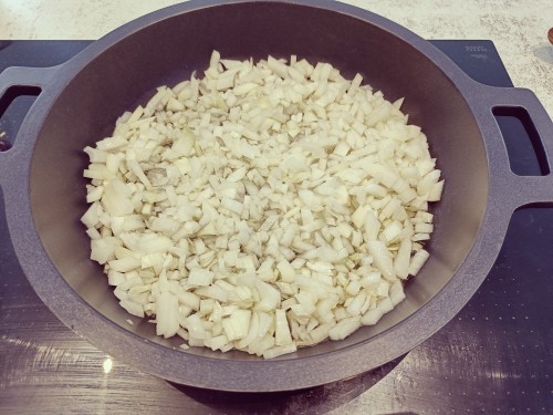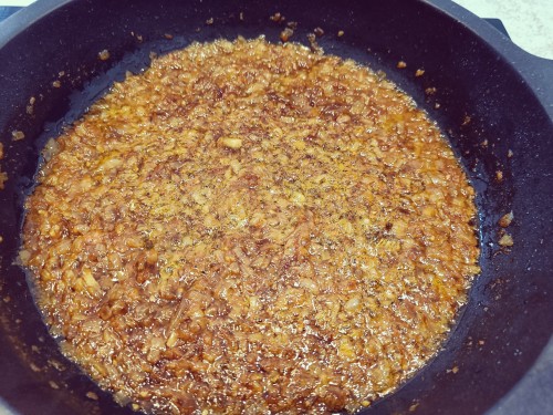 1Tallem la ceba molt petita i la posem a la olla amb bastant d'oli. Li deixem durant unes 2h a foc fluix. L'anem barrejant i de tant en tant li tirem una mica d'aigua.