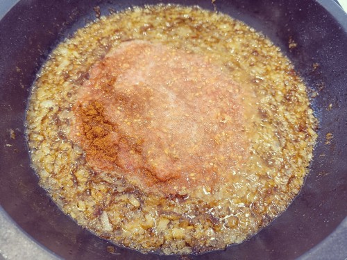 2Un cop la ceba està bastant poxa, li afegim la tomata rallada amb una mica de pebre vermell. Ho barregem tot i li deixem uns 15 minuts.