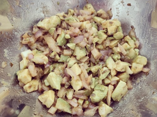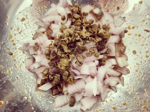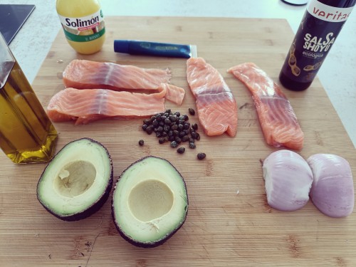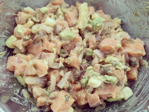 2Tallem a trossets petits les tàperes, la ceba, l'alvocat i el salmó. Ho barregem tot dins el bol i ho deixem reposar uns 30min