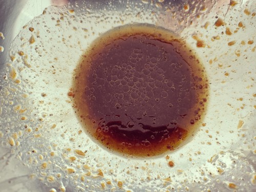 1Agafem un bol i hi posem la pasta wasabi, l'oli d'oliva, la salsa de soja, una mica de pebre negre i la pell de la lima. Ho barregem tot.