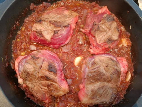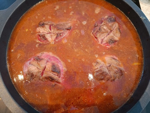 4Quan ja estigui evaporat hi afegim les galtes, la resta del vi i ho cobrim amb aigua.