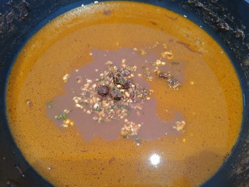 6Hi afegim també una picada que hem preperat (avellanes, xocolata, juliver, sal). Hi posem les galtes, la pastanaga tallada i ho deixem un 15 min mes. Hi afegim una mica mes d'aigua