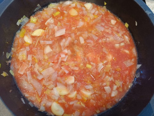 2Talles les cebes i el porro i ho posem a la olla. Quan estiguin ja una mica poxes hi afegim la tomata que hem ratllat previament.
