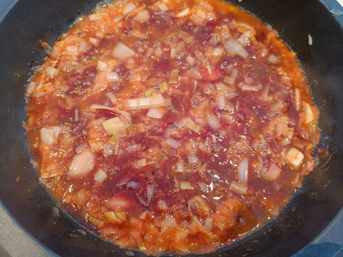 3Quan veiem que la tomata ja s'ha sofregit hi afegim la meitat del vi i ho posem a foc fort perque s'evapori.