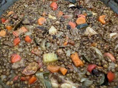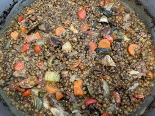 1Se pican todos los ingredientes y se sofrien con aceite de oliva y las especias, hasta que medio se pochen, se añaden las lentejas para que se impregnen del sofrito en seco y se echa el chorrito de vino se deja evaporar, se echan las carnes y se añade agua hasta cubrir . Se deja cocer media hora a fuego 7 y 15 minutos mas a 6. Se dejan reposar 10 minutos y a disfrutar!