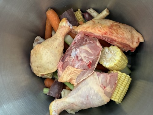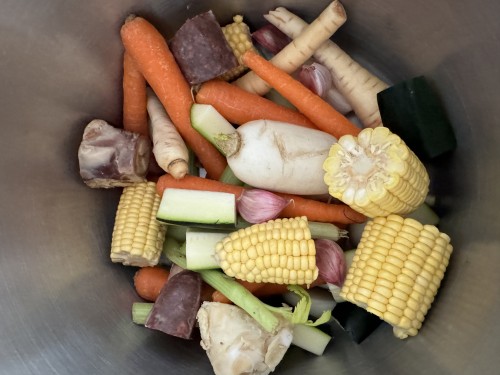 1Se añade en un caldero apto para caldo todas las verduras cortadas junto con los huesos y morcilla