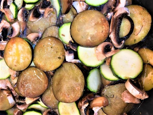 1Lo primero que ponemos en una olla plana es la berenjena para que se tueste un poquito con un chorro de aceite de oliva. Después añadimos el calabacín o los champis para que se tuesten antes de echarle un poco de vino blanco. Se hace hasta que este pochado.