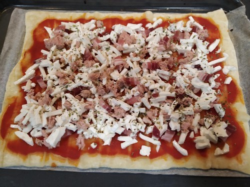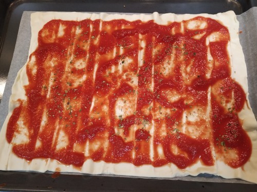 1Estenem la massa de Buitoni i li posem la tomata per sobre.. No n'hem de posar molta tampoc. Hi afegim orenga i ho posem 10 minuts al forn a 250 graus.