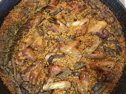 3Ara és el moment de posar-hi el caldo, el safrà i les branquetes de romaní. Tirarem 3 vegades mes de brou que d'arrós. Per 400g d'arrós hi posarem 1,2L de brou. Un cop li hem tirat agafem la marca a la paella. Després li afegim 2L mes d'aigua/brou i el fem bullir fins tornar a la marca anterior.