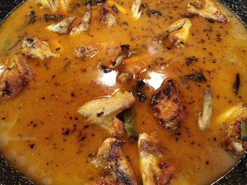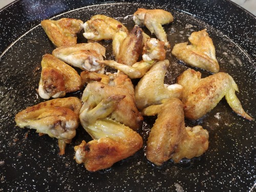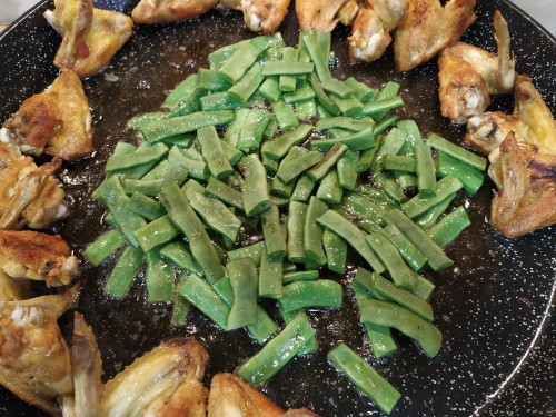 1Posem els trossets de pollastre en una paella, els salem i els fem fins que estiguin ben daurats. Després els apartem al voltant de la paella i hi posem la mangeta verda tallada.