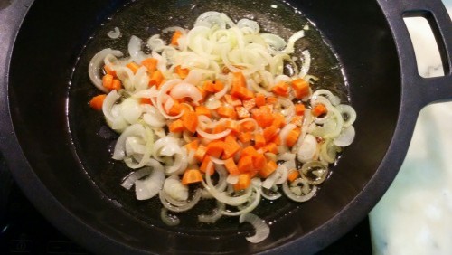 1Tallem la ceba amb talls allargats i la posem a fregir en una paella amb un raig d'oli juntament amb els alls. Quan la ceba porti uns 3 o 4 minuts, hi tirem la pastanaga tallada a cuadrets petits.