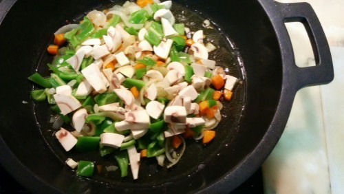 2Al cap d'uns 15 minuts hi afegim els xampinyons I quan aquests estiguin fets hi posem el pebrot verd