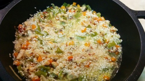 3Quan el sofregit estigui fet, afegim l'arrós i ho barregem amb la resta de sofregit. Després hi afegirem el got de vi blanc i ho deixarem reduir a foc fort.