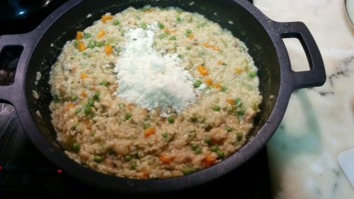 5Quan faltin 2 o 3 minuts perqué l'arrós estigui fet hi afegim formatge parmesà. Ho barregem bé. Ens ha de quedar bastant pastós.